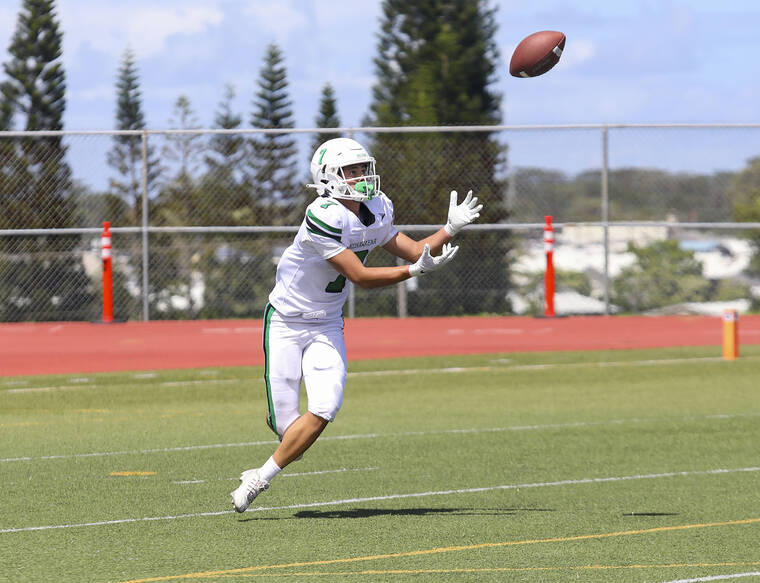 Kelsey Walling/Tribune-Herald Konawaena wide receiver Zed Anahu-Ambrosio runs to catch a pass before running in a touchdown during a game at Waiakea on Saturday.