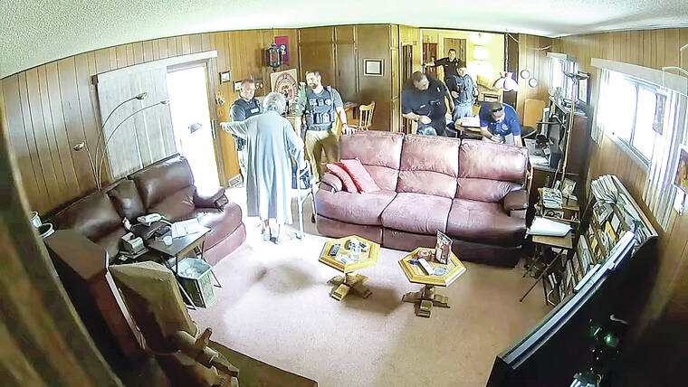 MARION, Kan. — Newly released video shows the 98-year-old mother of a Kansas newspaper publisher confronting police officers as they searched her home in a raid that has drawn national scrutiny, at one point demanding: “Get out of my house!”