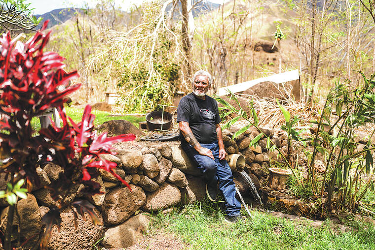 A Lahaina stream sustains Keʻeaumoku Kapu’s taro patches on his ancestral lands deep in Kauaula Valley in the mountains above Lahaina. He fled the town on the afternoon of the fire as flames approached and spent a night in his truck. The fire didn’t get close to his home and farm in the valley, but in 2018 area residents used water from the stream to fight a wildfire, he said.