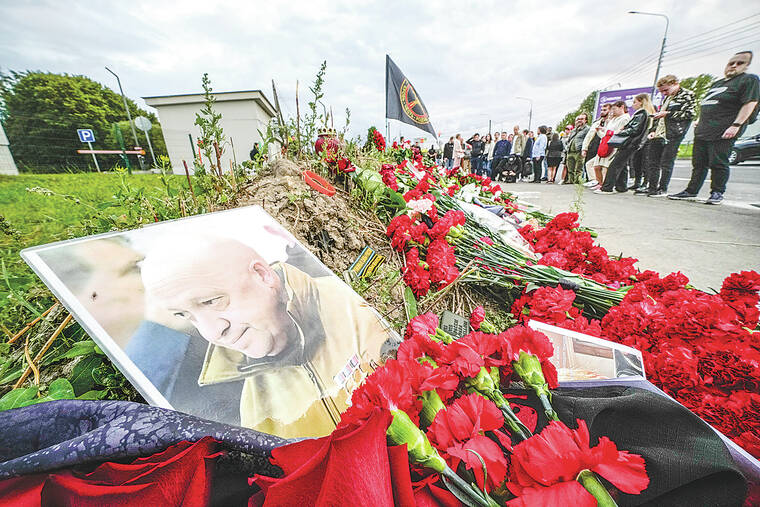 At Wagner’s headquarters in St. Petersburg, lights were turned on in the shape of a large cross, and Prigozhin supporters built a makeshift memorial, piling red and white flowers outside the building Thursday, along with company flags and candles.