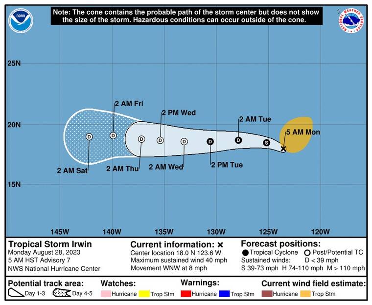 At 5 a.m. today, the center of Tropical Storm Irwin was about 2,060 miles east of Hilo.