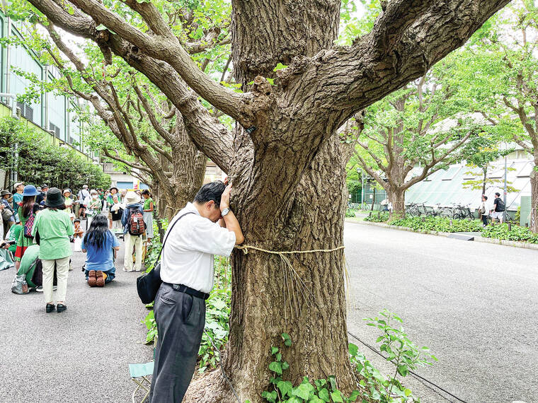 Takayuki Nakamura, among a few hundred people who gathered on Sunday to protest, pressed his face into the bark of one tree and prayed. The area was set aside 100 years ago to honor Japan’s Meiji Emperor.