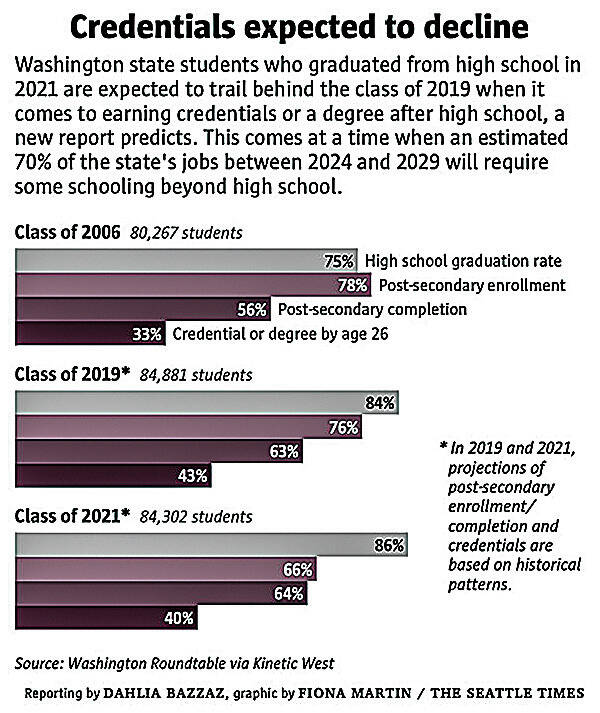 Soon, around 70% of jobs in Washington state will require some education beyond high school. Yet the rate of homegrown high school grads earning credentials here is on the decline, a new report says.