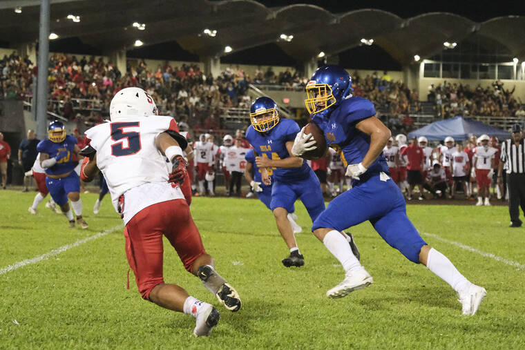 “My team has a lot of fight in them,” Hilo Head Coach John Flores III said. “We didn’t have a good outing like last week. I go back to last week, that was our first game — we didn’t have a preseason, last week was kind of a tune-up for us. In last week’s game, they also kept fighting. Konawaena kept their starters in the whole time.