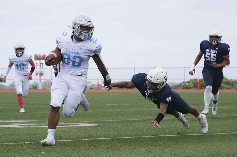 CONNOR WHITT/ Tribune-Herald Hercules Nahale (22) evades a tackle during Kealakehe's away victory at Waiakea HS on Saturday.