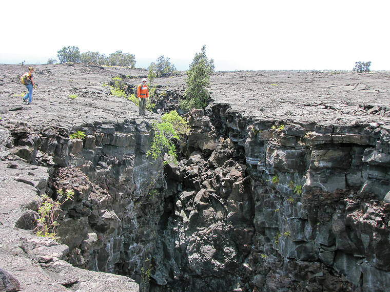 USGS photo USGS Hawaiian Volcano Observatory scientists investigate a portion of the Great Crack in the Keaiwa flow field on Kilauea Volcano's Southwest Rift Zone.