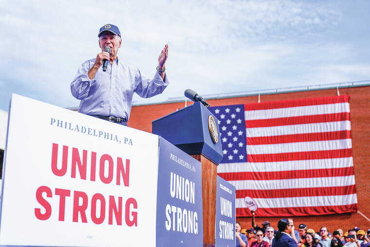 “We’re turning things around because of you. When the last guy was here, you were shipping jobs to China. Now we’re bringing jobs home from China,” Biden said in Philadelphia at a union hall Monday, an event that had the feel of a campaign-style rally. “When the last guy was here, your pensions were at risk. We helped save millions of pensions with your help.”