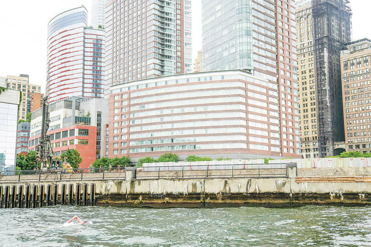 For a recent leg south of Albany recently, he snapped his cap and goggles over his head before jumping feet first from the inflatable boat accompanying him. He made sure to first take a swig from a bottle of Pepto-Bismol, a nod to the less-than-pristine water. He also rinsed with an antiseptic mouthwash, washed up with surgical soap and wore ear plugs.