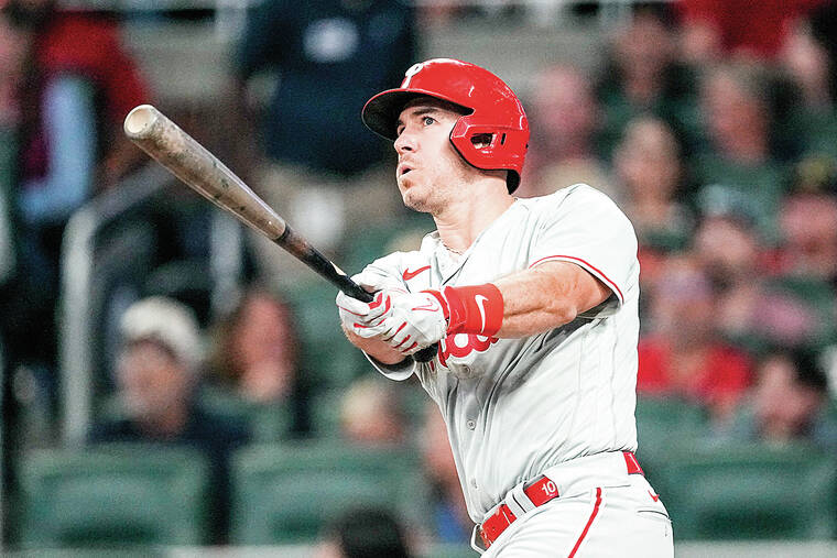 Bryce Harper, J.T. Realmuto, Nick Castellanos and Johan Rojas also homered to send the major league-leading Braves to their fourth straight loss.