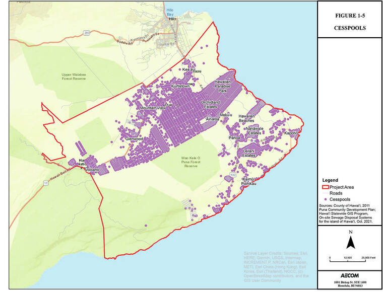 There is no county wastewater service in Puna, but state law requires all cesspools in the state be connected to a sewer system or be upgraded to a septic or aerobic treatment unit by Jan. 1, 2050. There are about 16,000 cesspools in Puna that discharge about 8.5 million gallons of untreated raw sewage effluent daily.