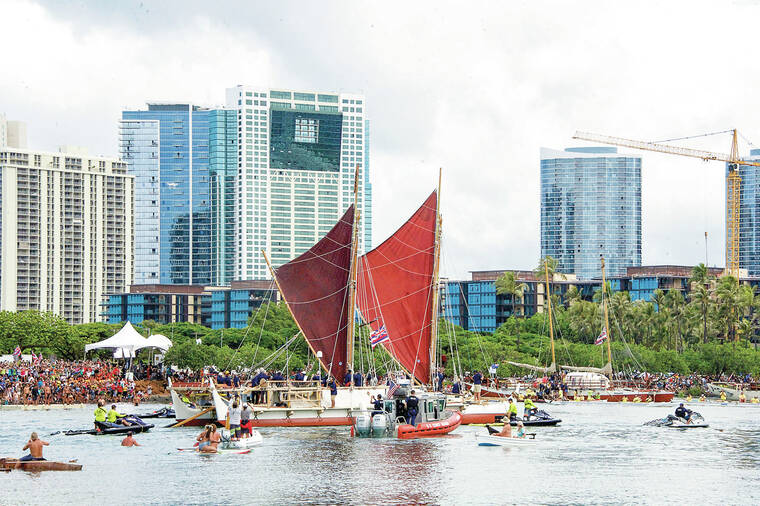 After 2,830 miles navigating by stars, waves and birds, and propelled by wind, the Polynesian voyaging canoe Hokulea was scheduled to sail into Aquatic Cove at noon Sunday. It was 18 minutes late, which did not matter to hundreds of people waiting in the grandstand.