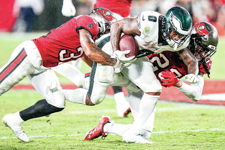 The Eagles led 25-3 by the time the Bucs finally got into the end zone on Baker Mayfield’s 1-yard TD throw to Mike Evans. A 2-point conversion trimmed Philadelphia’s lead to 14 with 9:22 remaining, but Hurts and the Eagles never let Tampa Bay get the ball back.
