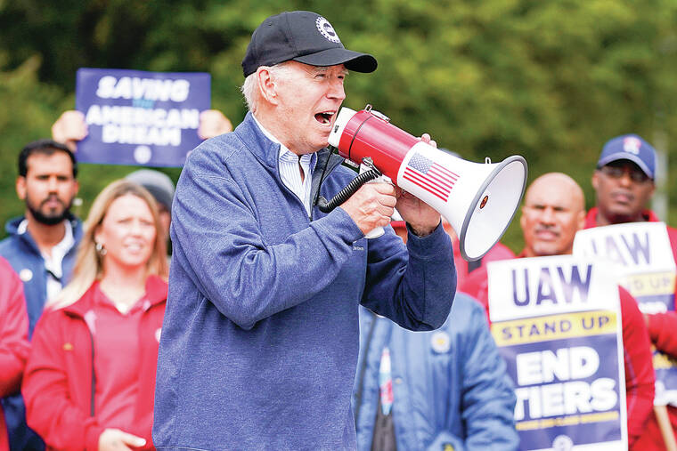 VAN BUREN TOWNSHIP, Mich. (AP) — President Joe Biden grabbed a bullhorn on the picket line Tuesday and urged striking auto workers to “stick with it” in an unparalleled show of support for organized labor by a modern president.