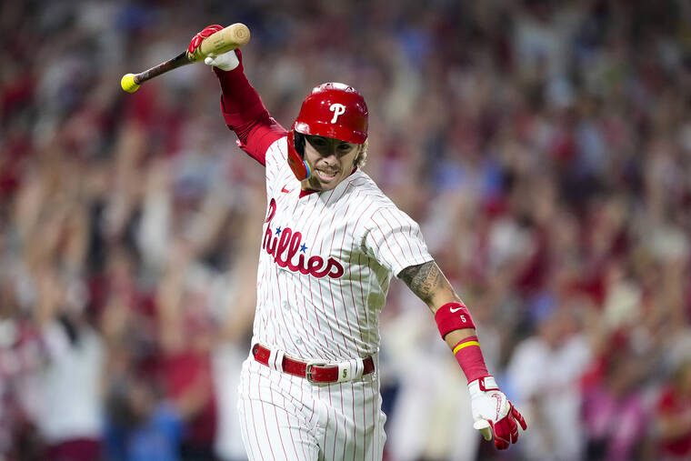 Stott provided one Wednesday when he turned on reliever Andrew Nardi’s first-pitch fastball in the sixth and launched it into the right-field seats for a 7-0 lead. He slammed his bat as he ran down the first-base line, and the Stott Shot sent Phillies fans into a delirious frenzy with the countdown to a clinch officially on. Nola followed Game 1 starter Zack Wheeler’s excellent effort with one of his own, and had 46,000 fans on their feet chanting “Let’s Go, Nola!” when he needed a lift.
