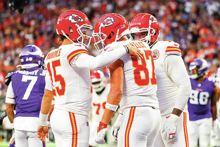 MINNEAPOLIS (AP) — Patrick Mahomes threw two touchdown passes in the third quarter, one to Travis Kelce after the All-Pro tight end briefly left the game with an ankle injury, and the Kansas City Chiefs beat the Minnesota Vikings 27-20 on Sunday.