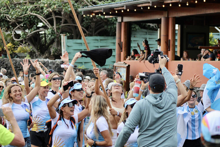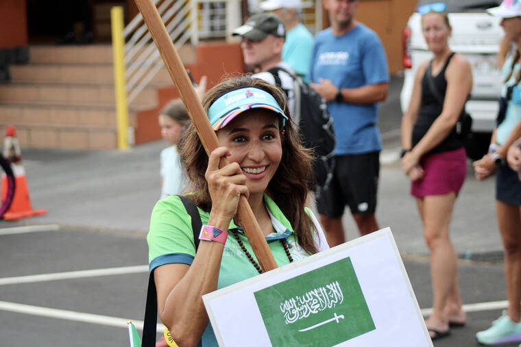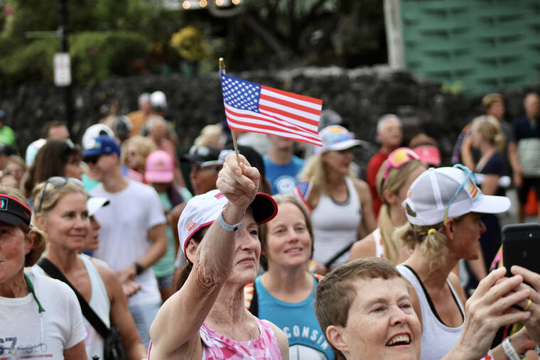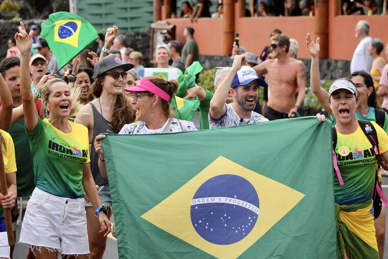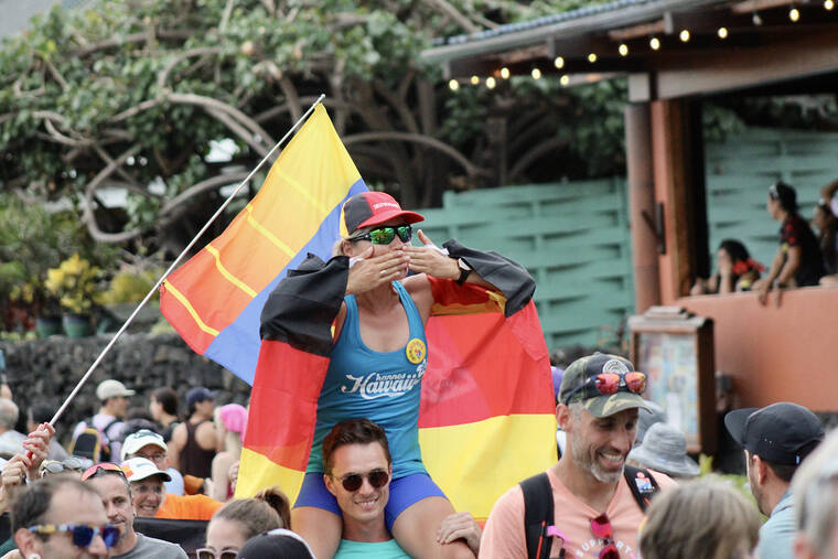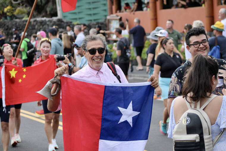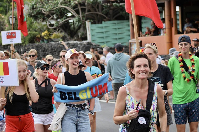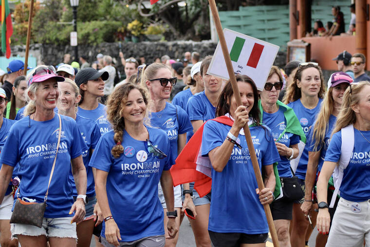 On Tuesday evening, more than 2,000 female competitors of over 70 countries marched in the annual Parade of Nations ahead of Saturday’s 2023 VinFast Ironman World Championship. The parade began at King Kamehameha Kona Beach Resort to Hale Halawai in downtown Kailua-Kona. Past Ironman legends also walked the event. (CONOR LANGS/WEST HAWAII TODAY)
