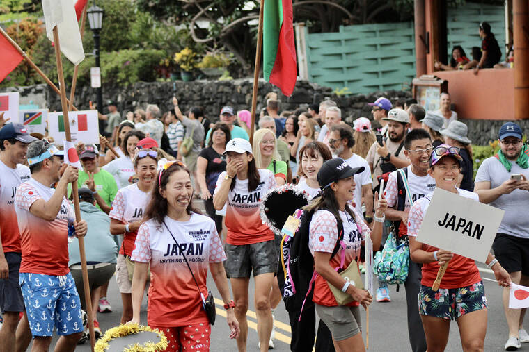 On Tuesday evening, more than 2,000 female competitors of over 70 countries marched in the annual Parade of Nations ahead of Saturday’s 2023 VinFast Ironman World Championship. The parade began at King Kamehameha Kona Beach Resort to Hale Halawai in downtown Kailua-Kona. Past Ironman legends also walked the event. (CONOR LANGS/WEST HAWAII TODAY)