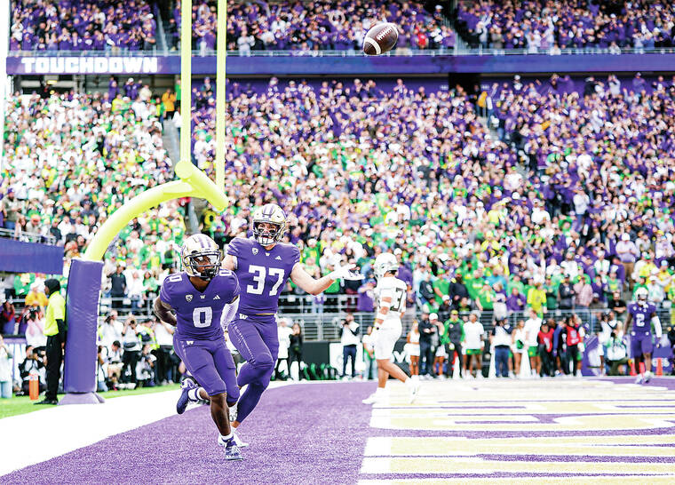 SEATTLE (AP) — Michael Penix Jr. threw an 18-yard touchdown pass to Rome Odunze with 1:38 remaining after another debatable fourth-down decision by Oregon, and Camden Lewis missed a 43-yard field goal attempt on the final play as No. 7 Washington held off No. 8 Oregon 36-33 on Saturday in another wild chapter to their heated rivalry.