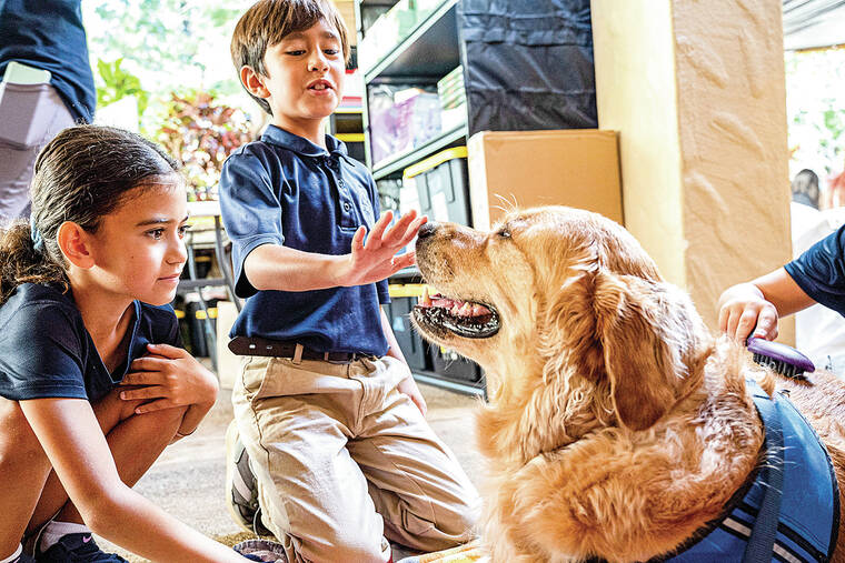 Cuaresma sat with a group of younger students petting a golden retriever comfort dog brought in by Assistance Dogs of Hawaii. Her home survived the fire but her dad only recently got his job back at a hotel. Being at Sacred Hearts was a good opportunity because the work was challenging, she said.