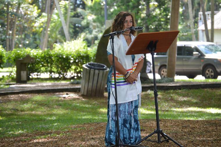 JOHN BURNETT/Tribune-Herald Rabbi Rachel Short, who organized the Vigil for Israel, addresses about 50 attendees Monday at Lili'uokalani Gardens in Hilo.