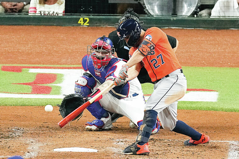 José Abreu hit a three-run homer right after Yordan Alvarez’s go-ahead sacrifice fly, and the Astros rolled to a 10-3 victory in Game 4 on Thursday night. They led 3-0 only four batters into the game, and responded immediately after Texas tied it on Corey Seager’s opposite-field homer in the third inning.