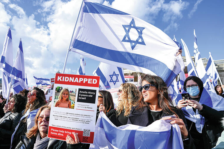 Some of those who gathered in front of Berlin’s Brandenburg Gate carried Israeli flags or posters with photos of some of the more than 200 people seized by Hamas as hostages during the militants’ deadly Oct. 7 incursion into Israel.