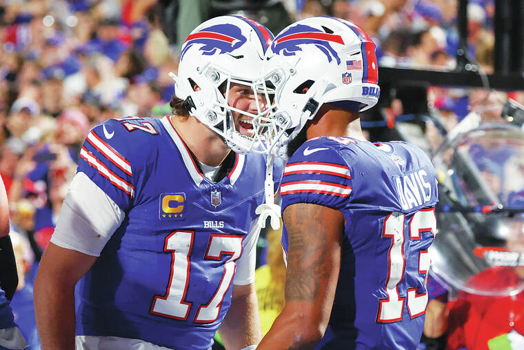 Gabriel Davis had a career-best nine catches for 87 yards and a touchdown, and rookie tight end Dalton Kincaid scored his first career TD on a 22-yard catch.