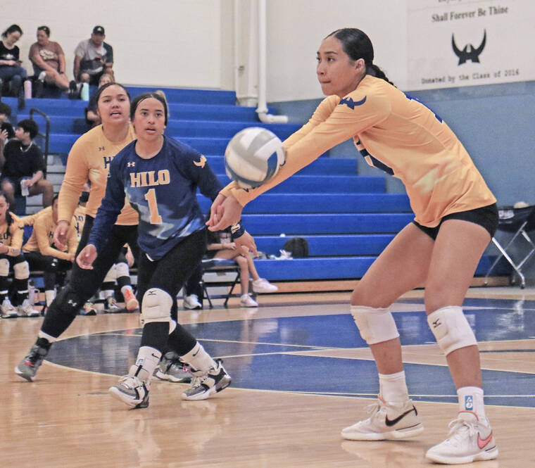 Hilo's Kaliko Kealoha digs a serve. ▲
