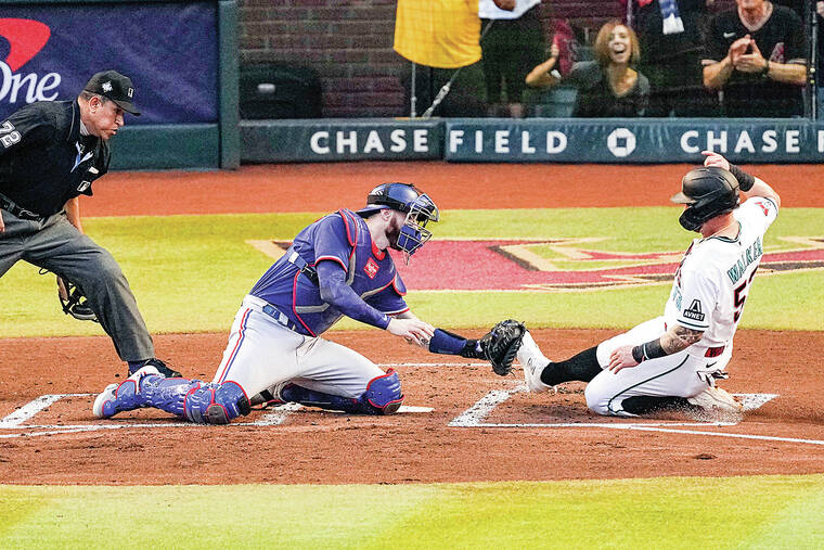 The D-backs rallied in the eighth when pinch-hitter Emmanuel Rivera led off with a double against Chapman. Geraldo Perdomo followed with an RBI single, making it 3-1. But then Chapman worked out of the jam — striking out Corbin Carroll before Seager started a clutch double play, sliding on his knees to field a hot smash from Ketel Marte before flipping to Semien, who relayed to first.