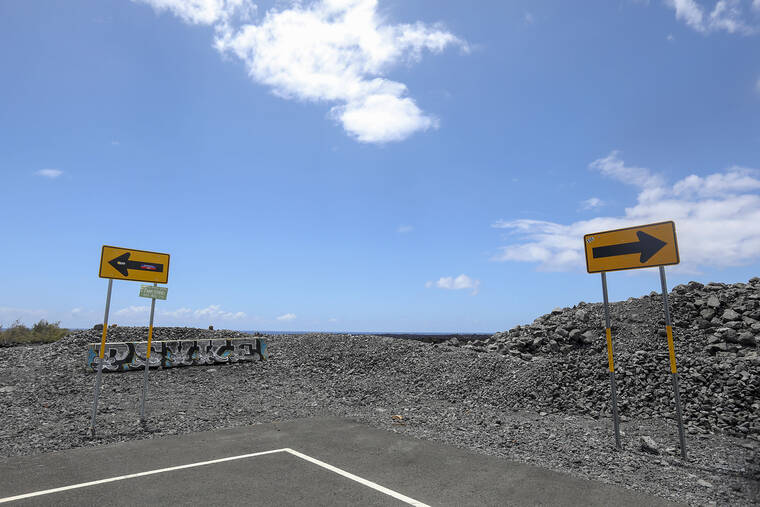 Kelsey Walling/Tribune-Herald Rocks block access to lava damage that can be seen from Highway 132 in Puna on Friday, May 15, 2020. Highway 132 was not extended to what used to be Lighthouse Road and Highway 137 when it was built through the lava damage.