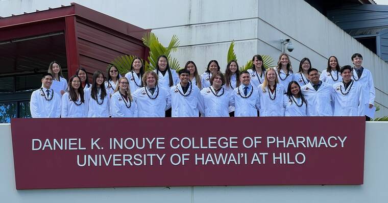 First-year students took the “oath of a pharmacist” as part of the annual University of Hawaii at Hilo Daniel K. Inouye College of Pharmacy White Coat Ceremony held Sunday, Oct. 22, in Hale Kiho‘iho‘i.