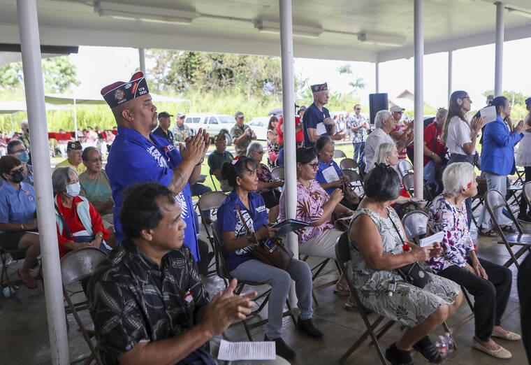 The ceremony was hosted by the Veterans of Foreign Wars Post No. 3830 in Pahoa and its Auxiliary. The air was filled with military marches, courtesy of the Hawaii County Band, speeches — and cheers from perhaps the most American of sporting contests, a nearby youth baseball game.