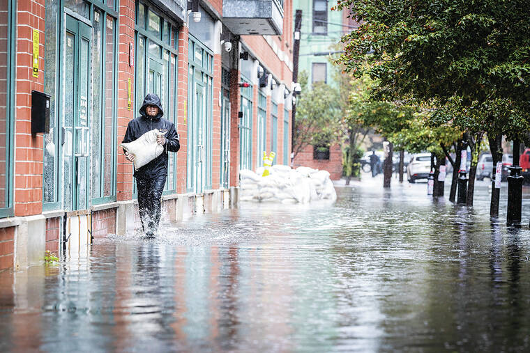 FILE - A person carries sands bags through water as heavy rains cause streets to flood in Hoboken, N.J., on Sept. 29, 2023. Revved-up climate change now permeates Americans’ daily lives with harm that is “already far-reaching and worsening across every region of the United States," a massive new government report says Tuesday, Nov. 14. (AP Photo/Stefan Jeremiah, File)