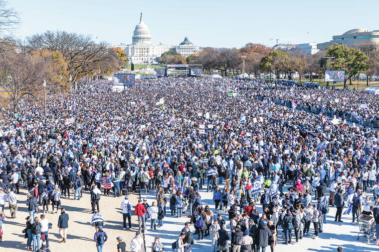 WASHINGTON — Supporters of Israel rallied by the tens of thousands on the National Mall under heavy security Tuesday, voicing solidarity in the fight against Hamas and crying “never again.”