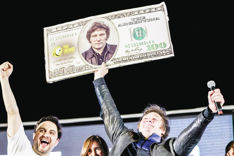 Milei, a self-described anarcho capitalist, has said he will abolish the Central Bank and has promoted replacing the local currency with the dollar to rein in inflation. He associated his campaign so closely with the idea that supporters at rallies carried giant 100-dollar bills bearing his face.