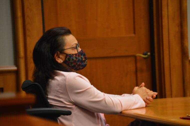 JOHN BURNETT/Tribune-Herald Patricia Wong, accused of the 2009 murder of Kaycee Smith, listens to her attorney, Aaron Wills, make his closing argument to the jury Wednesday in Hilo Circuit Court.