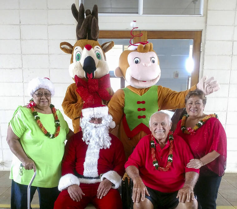 Courtesy of Pahala Town Lighted Christmas Parade Former Pahala parade organizers Mary Jane Ballio, Edward Andrade Jr. and Judy Andrade pose for a photo with Christmas mascots. The three retired from planning the annual Christmas parade after 2019.