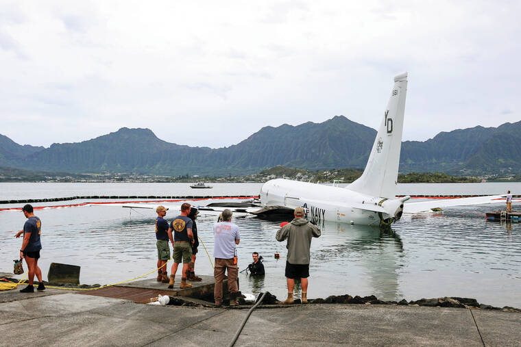 Navy officials said Monday that a team worked through the weekend to use inflatable cylinders, or roller bags, to lift and roll the plane off the reef where it crashed on Nov. 20 and move it to the nearby runway at Marine Corps Base Hawaii at Kaneohe Bay.