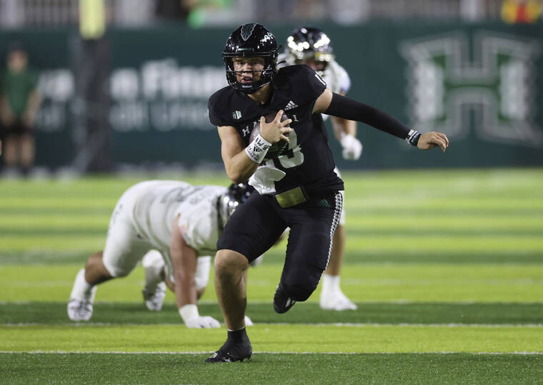 Hawaii quarterback Brayden Schager (13) scrambles through the Air Force defense during the first half of an NCAA college football game Saturday, Nov. 11, 2023, in Honolulu. (AP Photo/Marco Garcia)