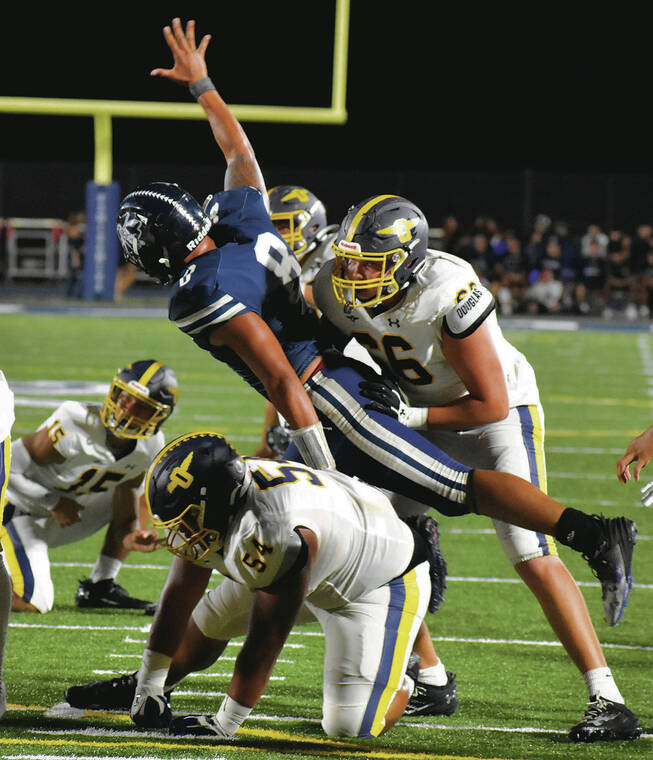 Jerry Campany / Jcampany@staradvertiser.com Kamehameha's Tristan Waiamau-Galindo tried to block a kick on Friday.