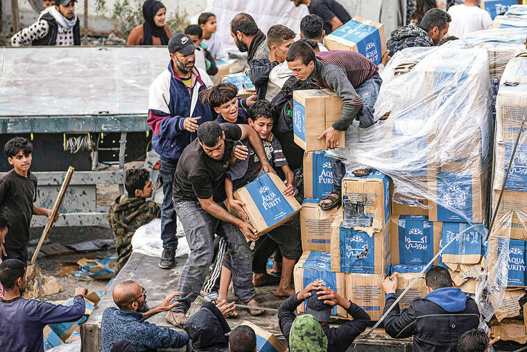 They survive off a trickle of humanitarian aid. Dozens of desperate Palestinians surrounded aid trucks after they drove in through the Rafah crossing with Egypt, forcing some to stop before climbing aboard, pulling down boxes and carrying them off. Other trucks appeared to be guarded by masked people carrying sticks.