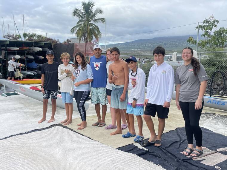 Courtesy photo Nathan Grocholski Lopez and his paddling students prepare to head out on the water on Monday afternoon near Kailua-Kona.
