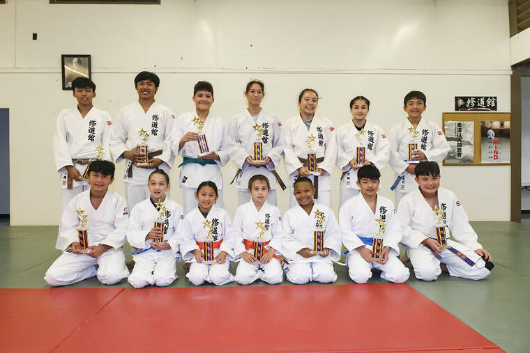 CONNOR WHITT/Tribune-Herald Shudokan's gold medal winners include, not in order, James "Trae" Rome, Johnny Armstrong, Karis Matsuo, Kyo Kobayashi, Ace Kobayakawa, Demian Iida, Ty Haraguchi, Kayako Kobayashi, Rynan Rodriguez, Lia Ballo, Kyler Aguiar, Ihilani Sakai, Iya Sadanchikova and Kainalu Aurello.