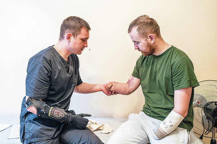 KYIV, Ukraine — When Alexis Cholas lost his right arm as a volunteer combat medic near the front lines in eastern Ukraine, his civilian career as a surgeon was over. But thanks to a new bionic arm, he was able to continue working in health care and is now a rehab specialist helping other amputees.