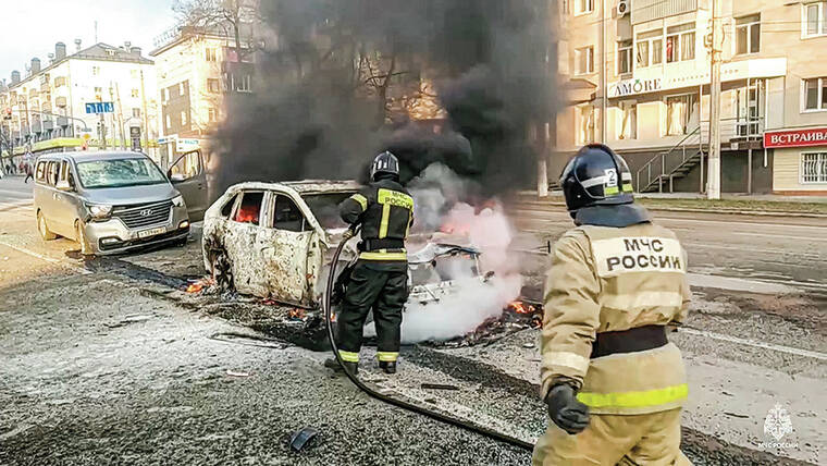 Images of Belgorod on social media showed burning cars and plumes of black smoke rising among damaged buildings as air raid sirens sounded. One strike hit close to a public ice rink in the very heart of the city, which lies 25 miles (40 kilometers) north of the Ukrainian border and 415 miles (670 kilometers) south of Moscow. While previous attacks have hit the city, they have rarely taken place in daylight and have claimed fewer lives.