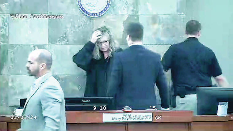 In a violent scene captured by courtroom video, Clark County District Judge Mary Kay Holthus fell back from her seat against a wall and suffered some injuries but was not hospitalized, courthouse officials said.