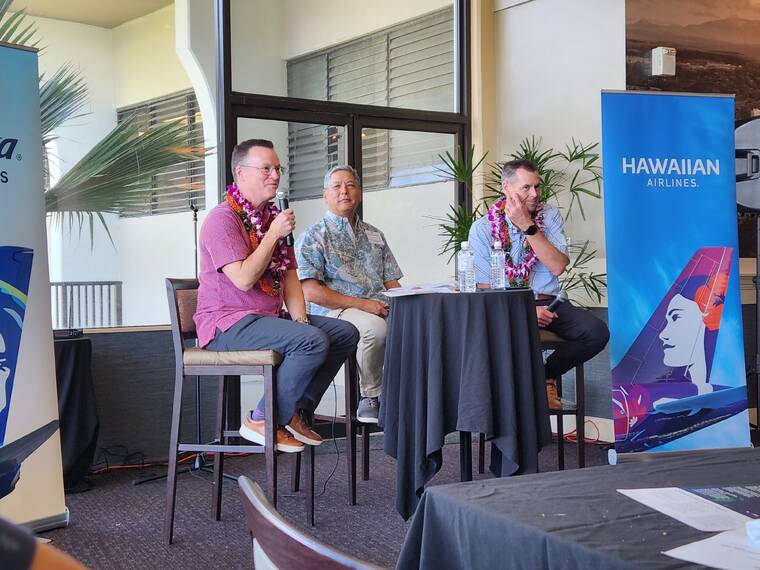 MICHAEL BRESTOVANSKY/Hawaii Tribune-Herald From left to right: Alaska Airlines Regional President of Hawaii/Pacific Joe Sprague, Hawaii Island Chamber of Commerce President Randy Kurohara, and Hawaiian Airlines President Peter Ingram speak at an HICC event Monday in Hilo.
