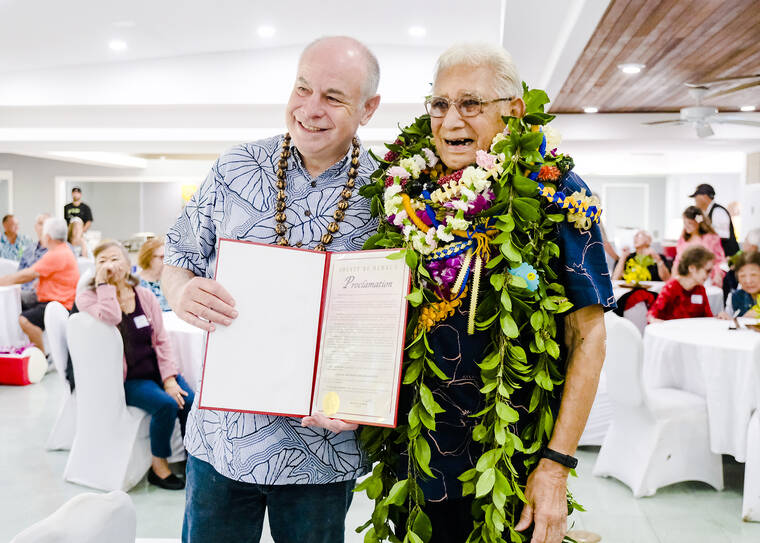 Mayor Mitch Roth proclaimed Jan. 6 “Coach Larry and Al Manliguis Day” in Hawaii County, as announced Saturday during a luncheon at Nani Mau Restaurant and Garden.