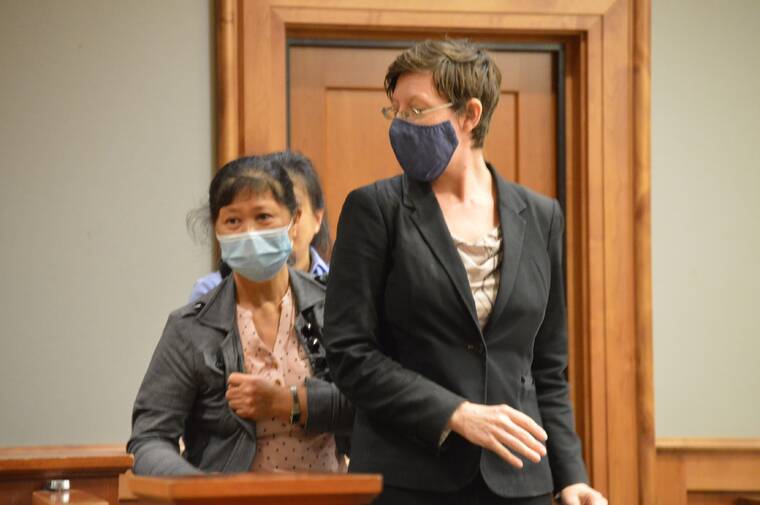 JOHN BURNETT/Tribune-Herald Mei Qin Chen, left in blue mask, turns to friends or family members in the gallery Monday in Hilo Circuit Court. At right is her attorney, Deputy Public Defender Megan Fellows, and behind her is a Mandarin language interpreter.