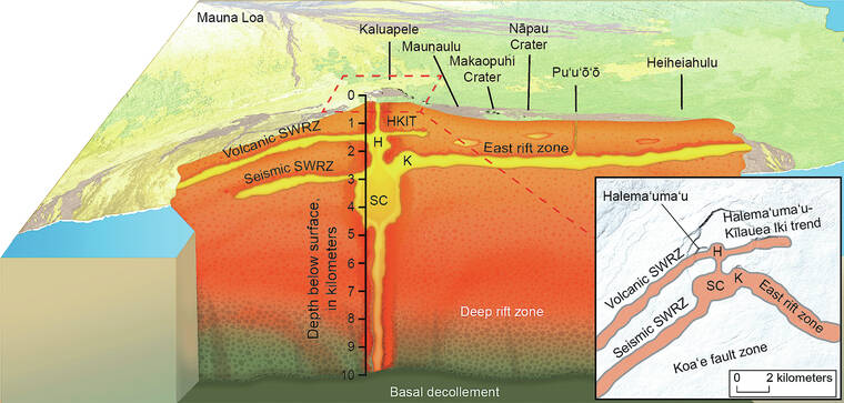 Magma can also be stored in an area referred to as the seismic Southwest Rift Zone, which lies about 2 miles (3 km) beneath the surface between Kilauea caldera and the Koa‘e Fault System. Episodes of magma accumulation in this region are frequent — for example, in 2006, 2015, 2021, and during October–November 2023; eruptions from this area, however, are rare.